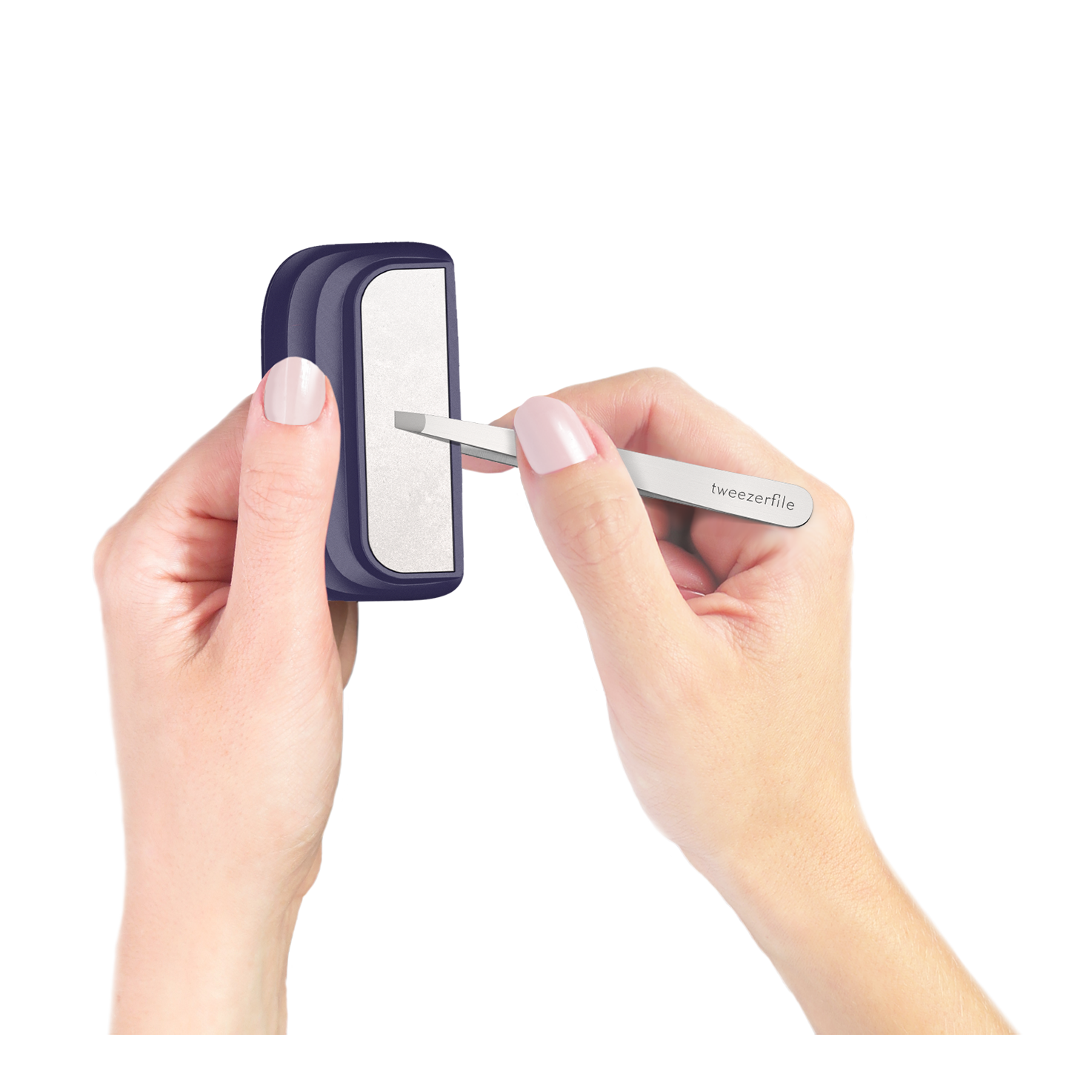 Hold the tweezerfile in one hand and grip the blade with your tweezer - Slide the tweezer up and down, gently applying equal pressure on the top and bottom blade - voilà - Admire how your tweezers are back to their old glory, gripping even the shortest hair!